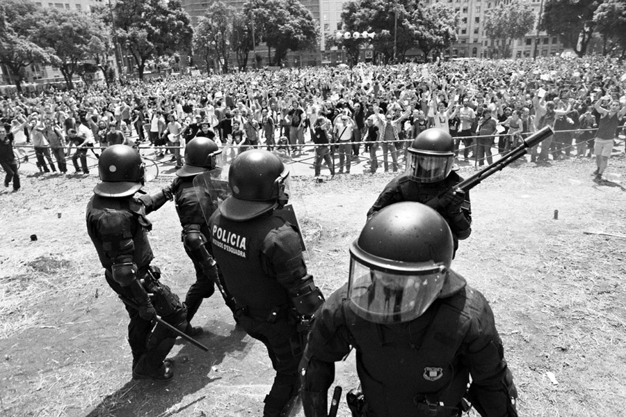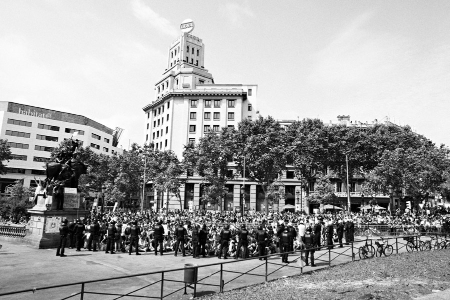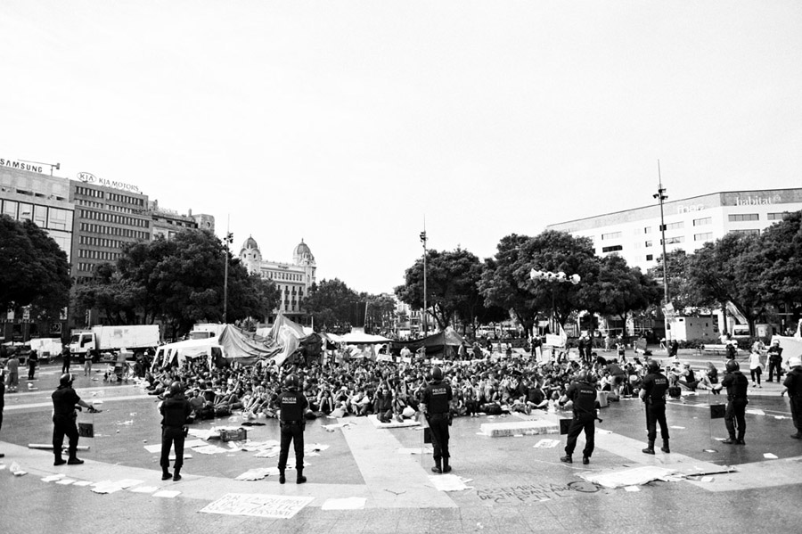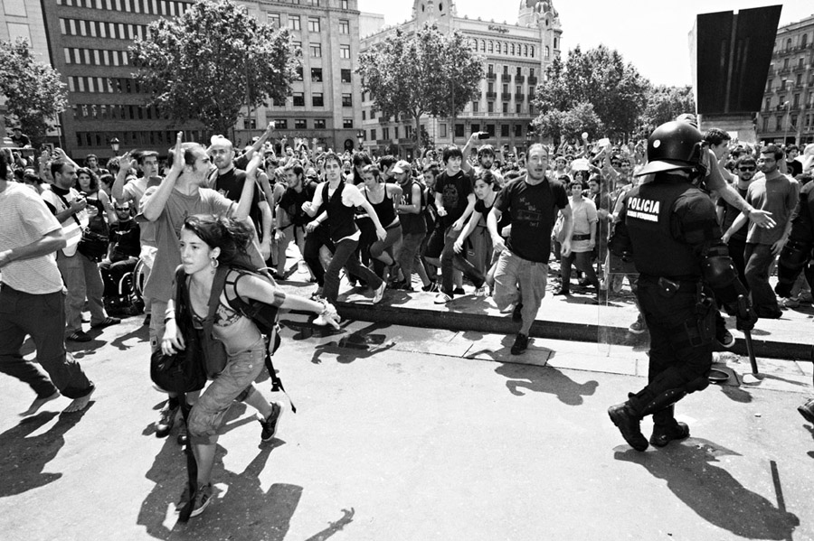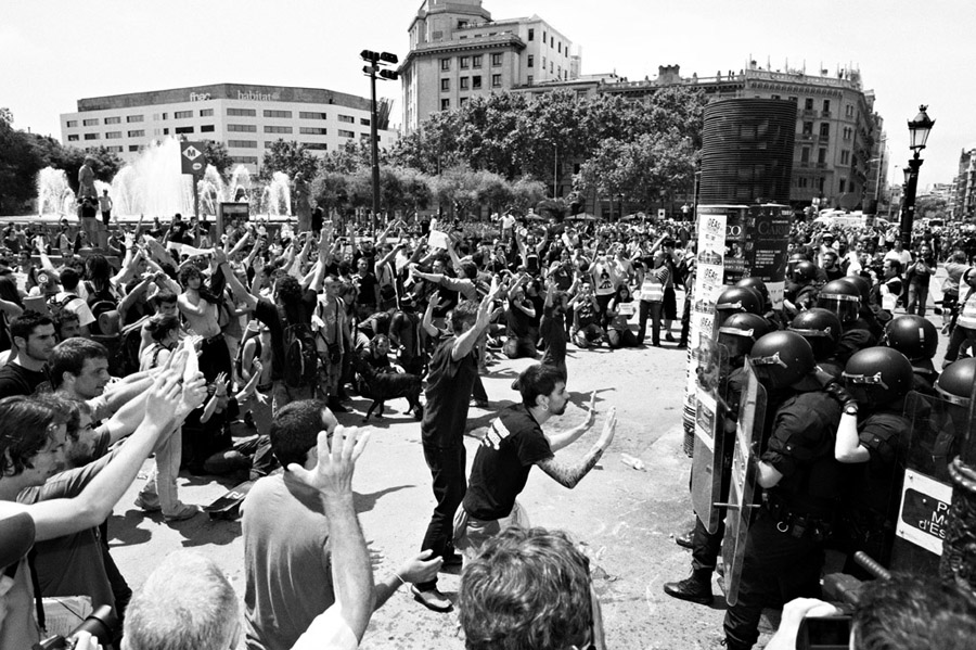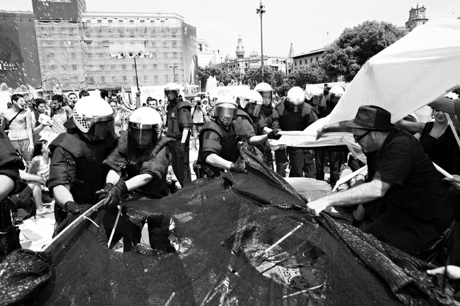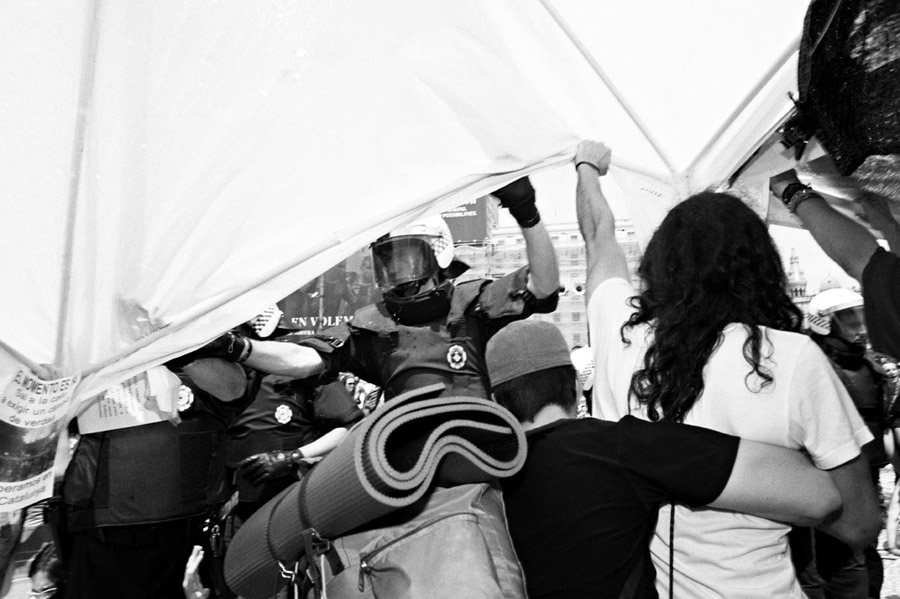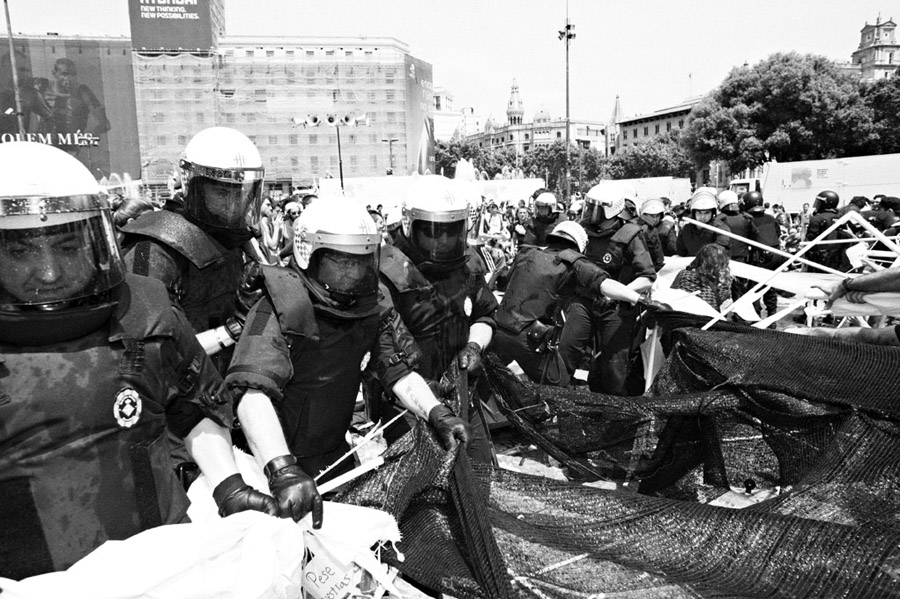 27 de Maig de 2011, primer intent de desallotjament de l’acampada de Plaça Catalunya de Barcelona per part dels Mossos d’Esquadra i la Guàrdia Urbana.